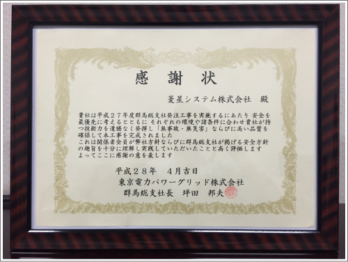 東京電力パワーグリッド㈱群馬総支社より感謝状を授与